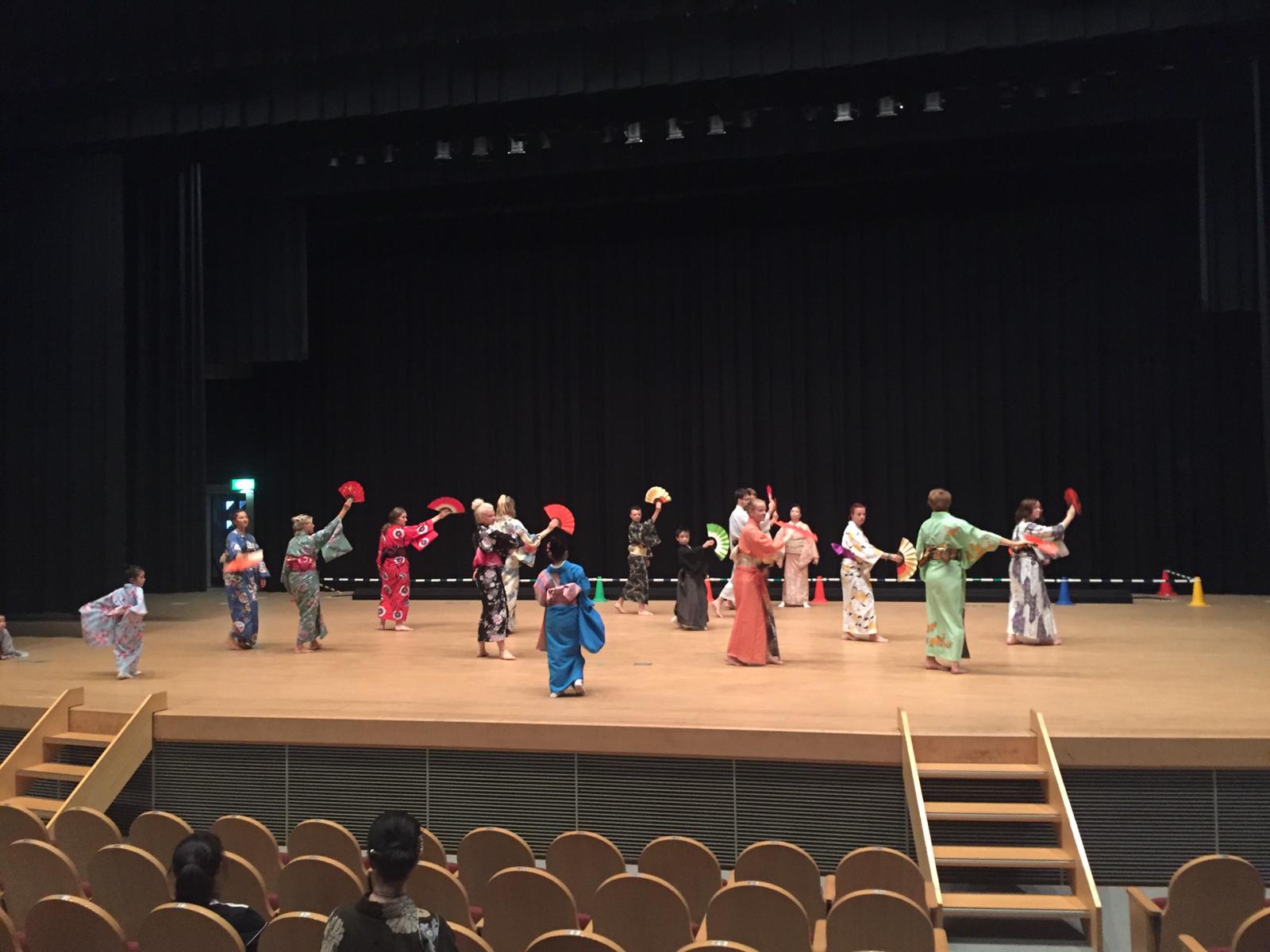 Anschließend machten wir uns auf dem Weg um Sommerkimonos, auf japanisch „Yukata“, anzuziehen. In diesen ging es gleich weiter, um, mehr oder weniger erfolgreich, einen japanischen Tanz zu lernen.