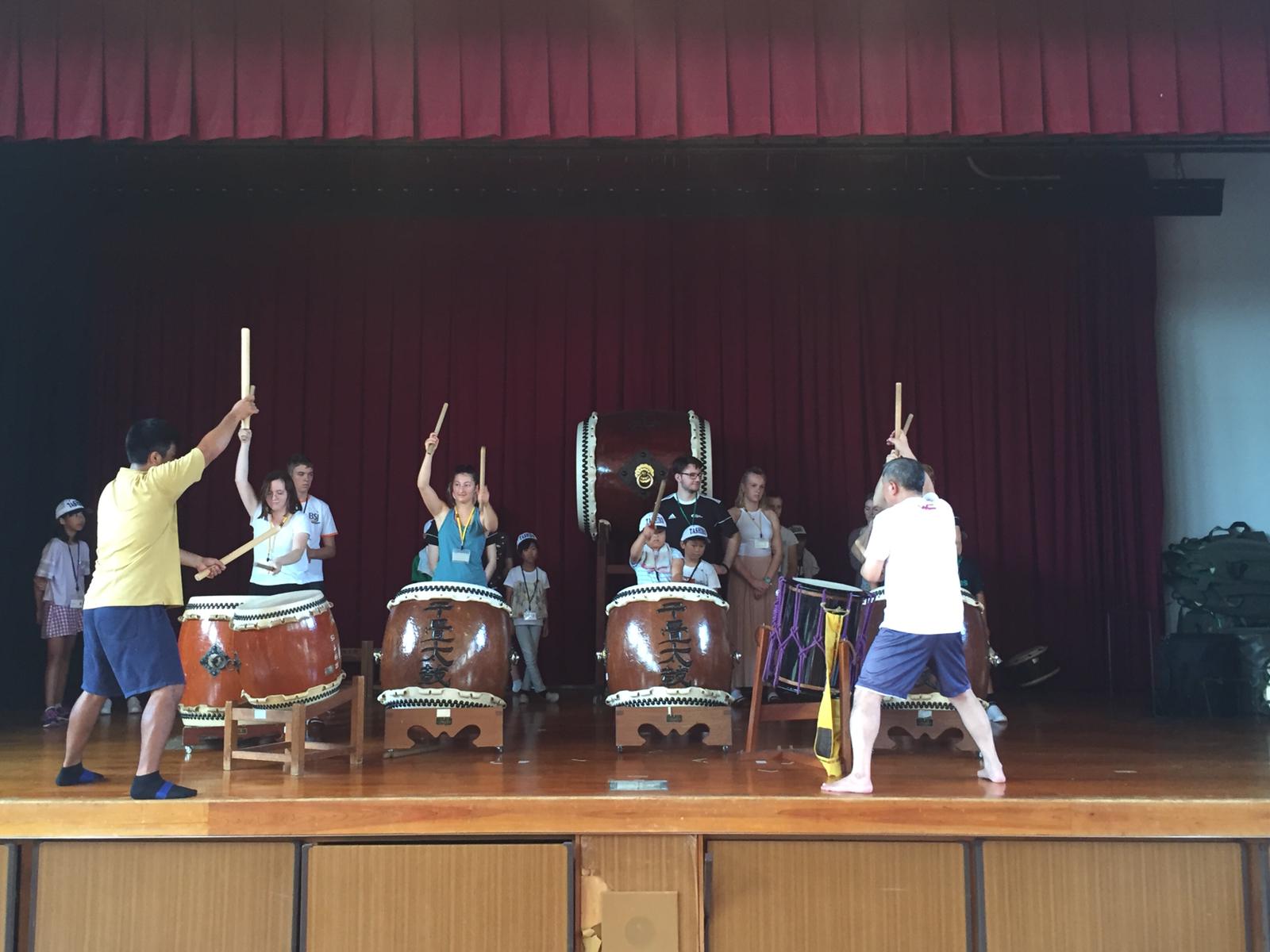 Heute begann unser Tagesprogramm, gemeinsam mit Kindern der Stadt, damit zu lernen, wie man auf japanischen Trommeln spielt.